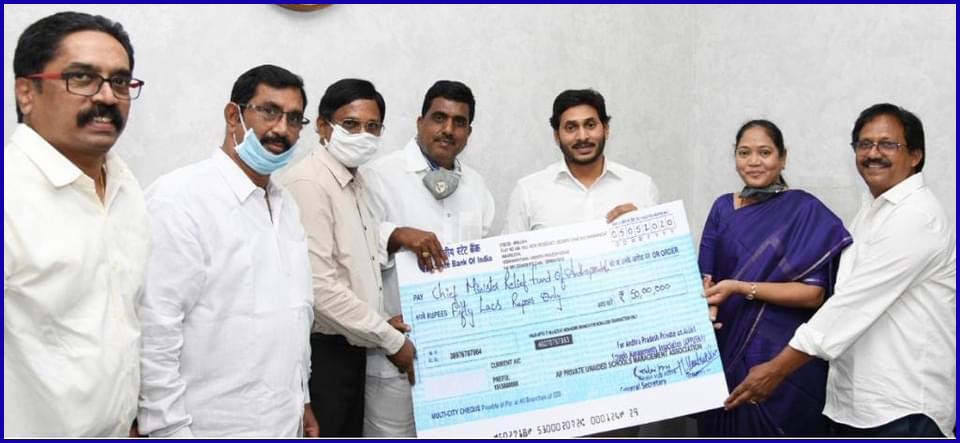 కోవిడ్ –19 నివారణలో భాగంగా సహాయ చర్యల కోసం ముఖ్యమంత్రి సహాయనిధికి ఏపీ ప్రైవేట్ అన్ ఎయిడెడ్ స్కూల్స్ మేనేజ్మెంట్ అసోసియేషన్ (అపుస్మా) రూ. 50,00,000/- విరాళం